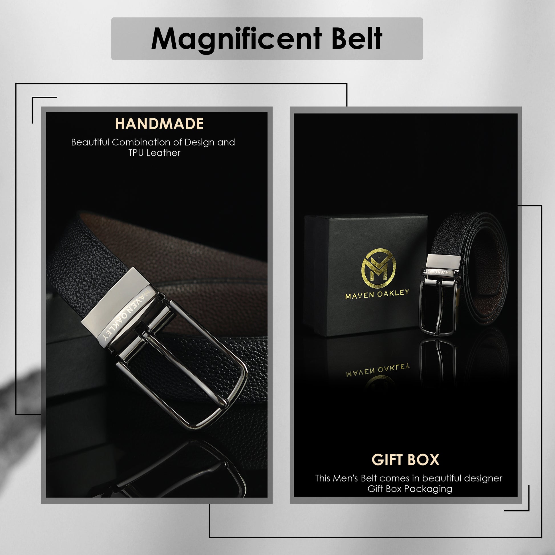 Upgrade your everyday style with the Maven Oakley Axel PU Reversible Black & Brown Belt — a refined and versatile accessory designed for men who value smart design, durability, and everyday comfort. Featuring a sleek 360° rotating matte grey buckle, this belt allows you to switch effortlessly between classic black and rich brown, giving you two polished looks in one premium piece.